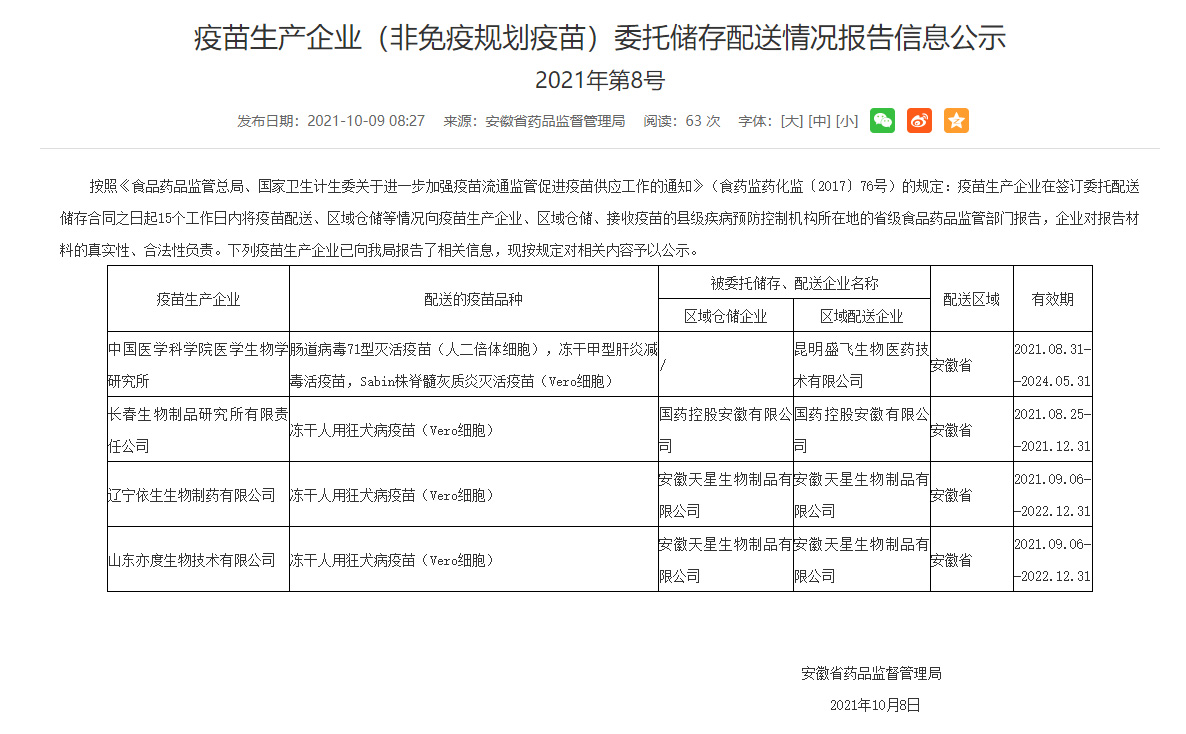 疫苗生產(chǎn)企業(yè)(非免疫規(guī)劃疫苗)委托儲(chǔ)存配送情況報(bào)告信息公示_安徽省藥品監(jiān)督管理局